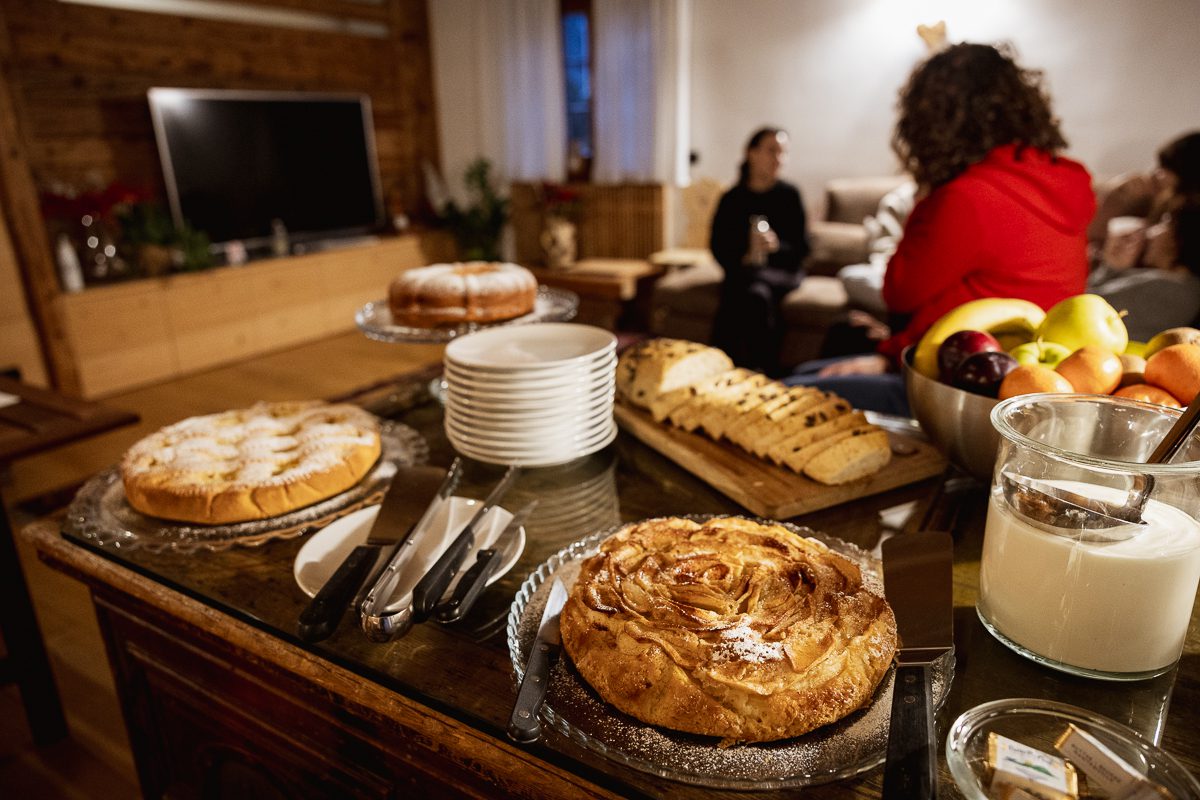 La giornata inizia con una colazione che difficilmente dimenticherai: immagina di scendere ancora in pigiama in una sala calda, in stile montano, e trovare una mamma pronta a coccolare tutte, dal dolce al salato.